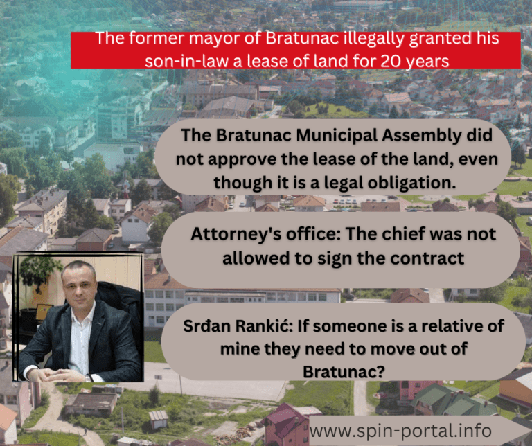 At the beginning of autumn last year, on September 27, 2022, to be exact. The municipality of Bratunac concluded an agreement with the company “ECO PRODUCT” on the lease of land within the industrial zone in the locality “Ciglana” with a total area of 5,474 m2. The contract was concluded for 20 years starting on October 1, 2022. The municipality was represented by the then mayor Srđan Rankić, and the company “ECO PRODUCT” was represented by Rankić’s son-in-law Milovan Bojić.