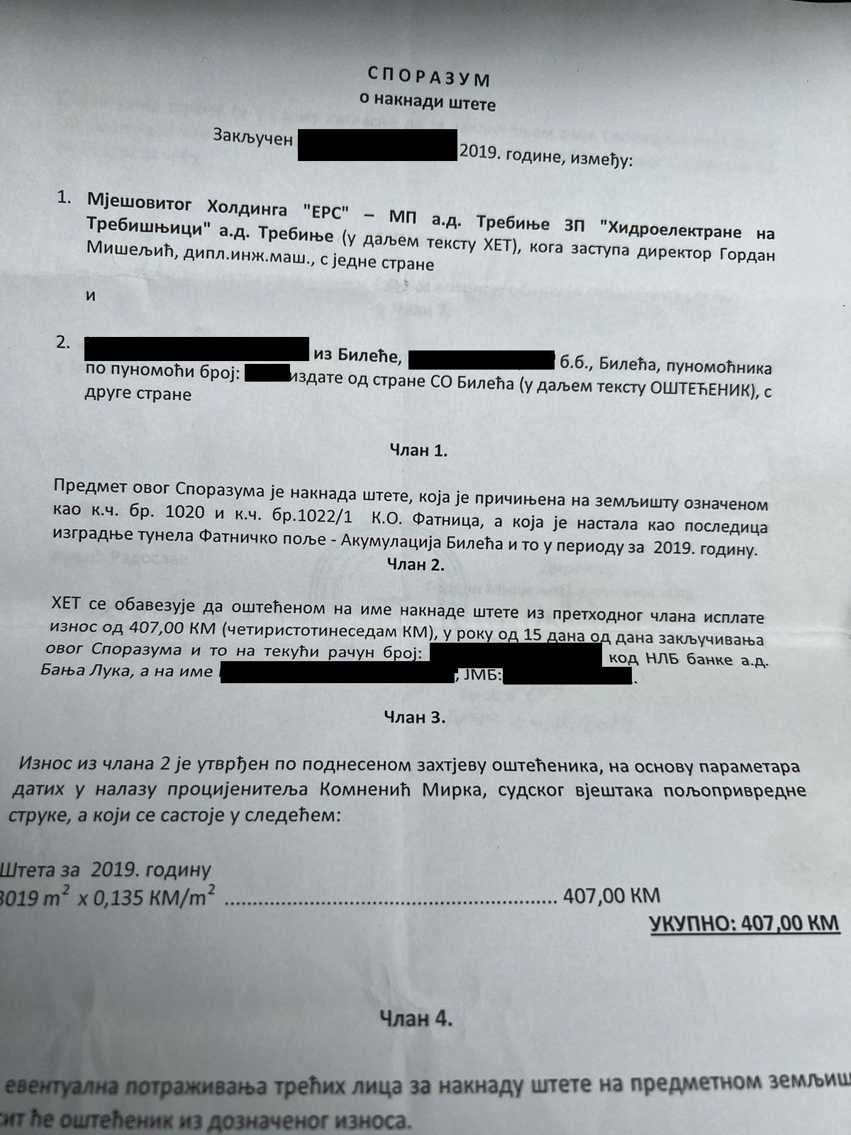 “Predmet ovog Sporazuma je naknada štete, koja je pričinjena na zemljištu, a koja je nastala kao posljedica izgradnje tunela Fatničko polje — akumulacija Bileća”, navodi se, između ostalog, u pomenutim sporazumima.