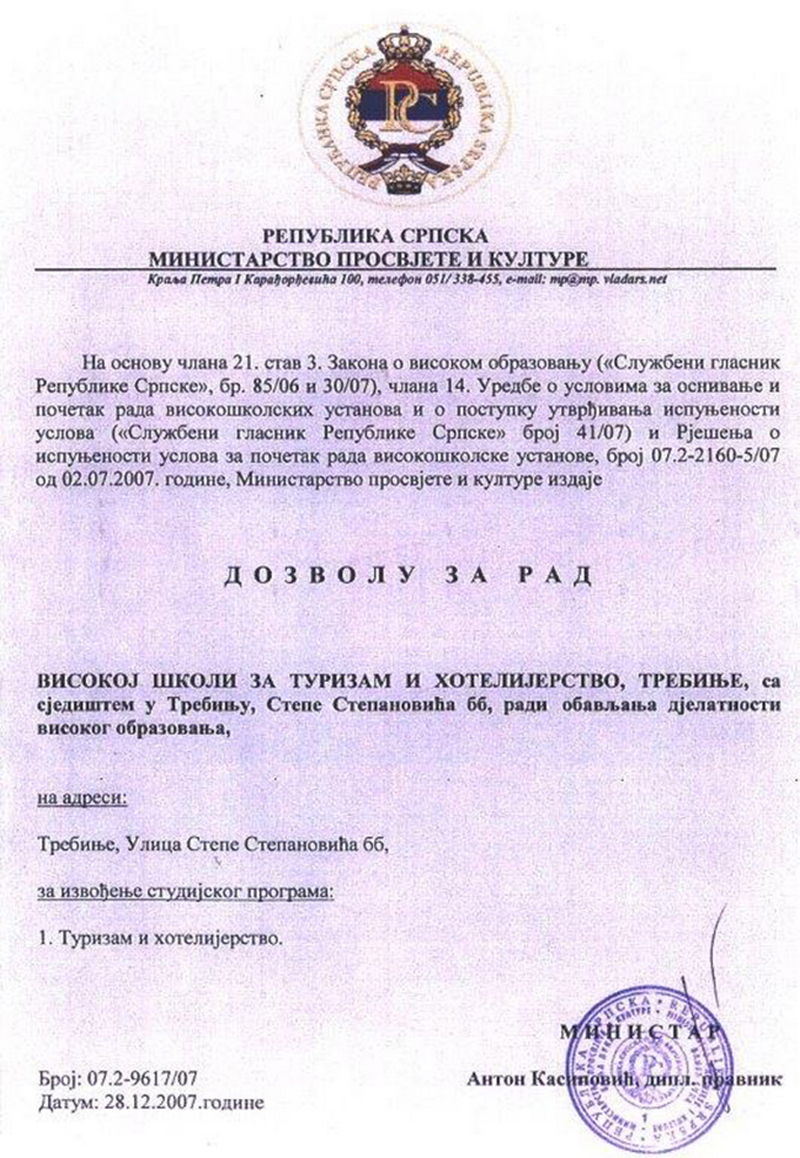 Ne mali broj kadrova u vlasti lokalnih zajednica Istočne Hercegovine, pa i onih u javnim ustanovama, organizacijama i institucijama, u svojoj biografiji navode da su diplomirali na Visokoj školi za hotelijerstvo i turizam Trebinje. No, radi se o školi koja još uvijek nije akreditovana. Nema je ni u registru kod Agencije za razvoj visokog obrazovanja i osiguranja kvaliteta u BiH, a ni kod Agencije za visoko obrazovanje RS, piše portal Antikorupcija.