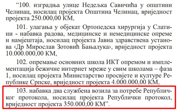 Tako je na primjer na listu prioritetnih projekata koji će se finansirati iz budžeta Republike Srpske kao javna investicija uvršena i nabavka automobila za Republički protokol.