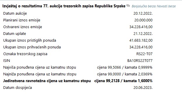 Riječ je o aukciji šestomjesečnih trezorskih zapisa sa rokom dospijeća 20. jun 2023. godine.
