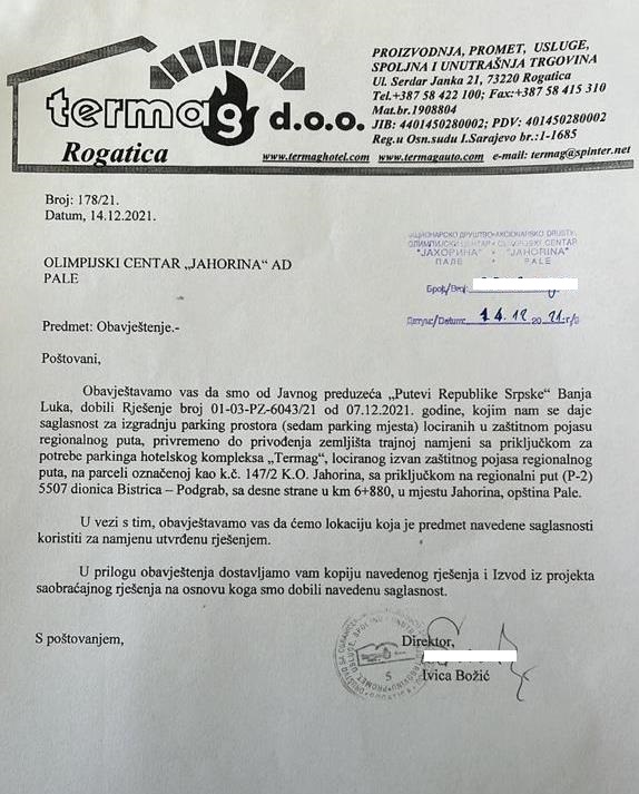 Naš sagovornik objašnjava da je Olimpijski centar “Jahorina” 14. decembra 2021. godine, dobio obavještenje od “Termaga” u kojem tvrde da su od Javnog preduzeća “Putevi Republike Srpske” dobili rješenje kojim im se daje saglasnost za “izgradnju parking prostora” sa sedam parking mjesta lociranih u zaštitnom pojasu regionalnog puta.