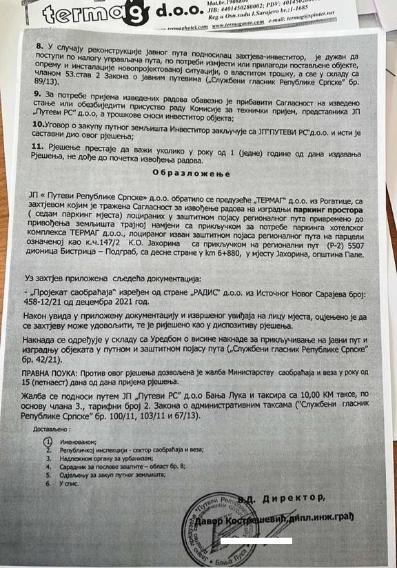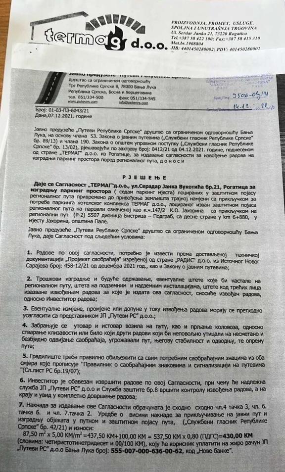 “Obavještavamo vas da smo od JP ‘Putevi RS’ Banjaluka dobili rješenje kojim nam se daje saglasnost za izgradnju parking prostora (sedam parking mjesta) lociranih u zaštitnom pojasu regionalnog puta, privremeno do privođenja zemljišta trajnoj namjeni sa priključkom za potrebe parkinga hotelskog kompleksa “Termag”, lociranog izvan zaštitnog pojasa regionalnog puta, sa priključkom na regionalni put sa desne strane. U vezi s tim, obavještavamo vas da ćemo lokaciju, koja je predmet navedene saglasnosti, koristiti za namjenu utvrđenu rješenjem”, navodi se u obavještenju “Termaga”.