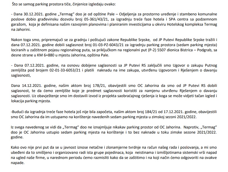 “OC Jahorina nikada nije iznajmio nikakav parking prostor Hotelu ‘Termag’ na korištenje, odnosno Hotel ‘Termag’ nikada nije koristio niti koristi bilo kakav parking prostor koji je vlasništvo OC Jahorina. Nije nam poznato odakle dezinformacija da nam je OC iznajmio parking prostor na korištenje. Odgovorno tvrdimo da to nije tačno, da je izmišljeno i zlonamjerno sa ciljem da diskredituje i naruši ugled dobrog, savjesnog i uspješnog privrednika koji ‘Termag’ gradi godinama”, poručeno je u odgovoru iz pomenutog hotela.