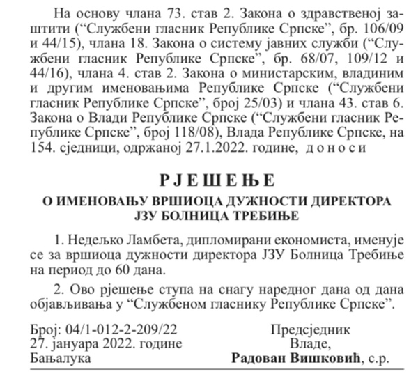 “Direkt” je ranije pisao o dvostrukom protivzakonitom imenovanju Lambete na mjesto vršioca dužnosti direktora trebinjske Bolnice. On je tada imenovan iako nije imao šest mjeseci iskustva u zdravstvenom menadžmentu, što je bilo propisano statutom ove zdravstvene ustanove.