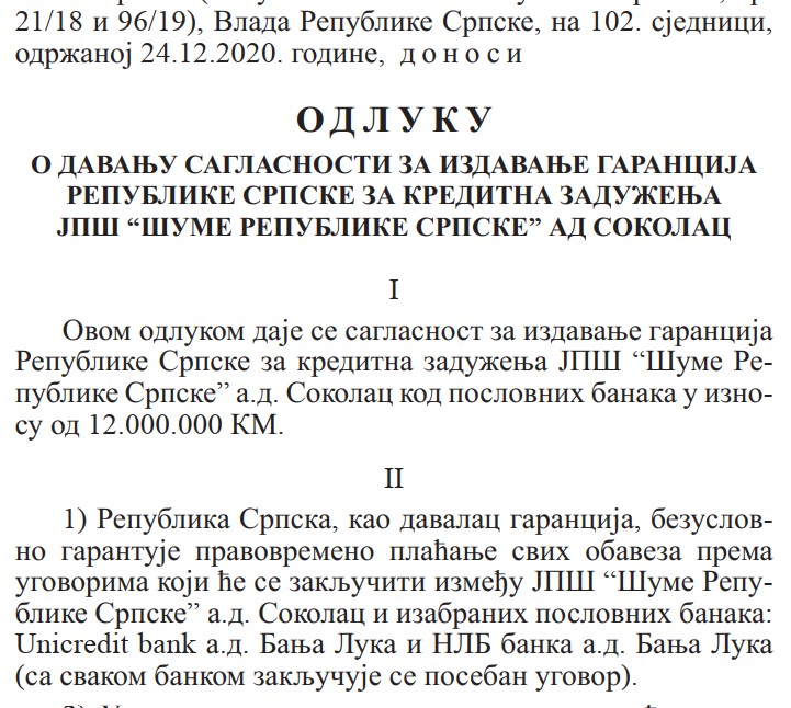“Republika Srpska bezuslovno garantuje pravovremeno plaćanje svih obaveza prema ugovorima koje će zaključiti Šume Republike Srpske sa bankama. U slučaju dospjelog i neplaćenog anuiteta RS će izvršiti plaćanje iz budžeta”, navodi se u Odluci o davanju saglasnosti na izdavanje garancija za kreditno zaduženje.