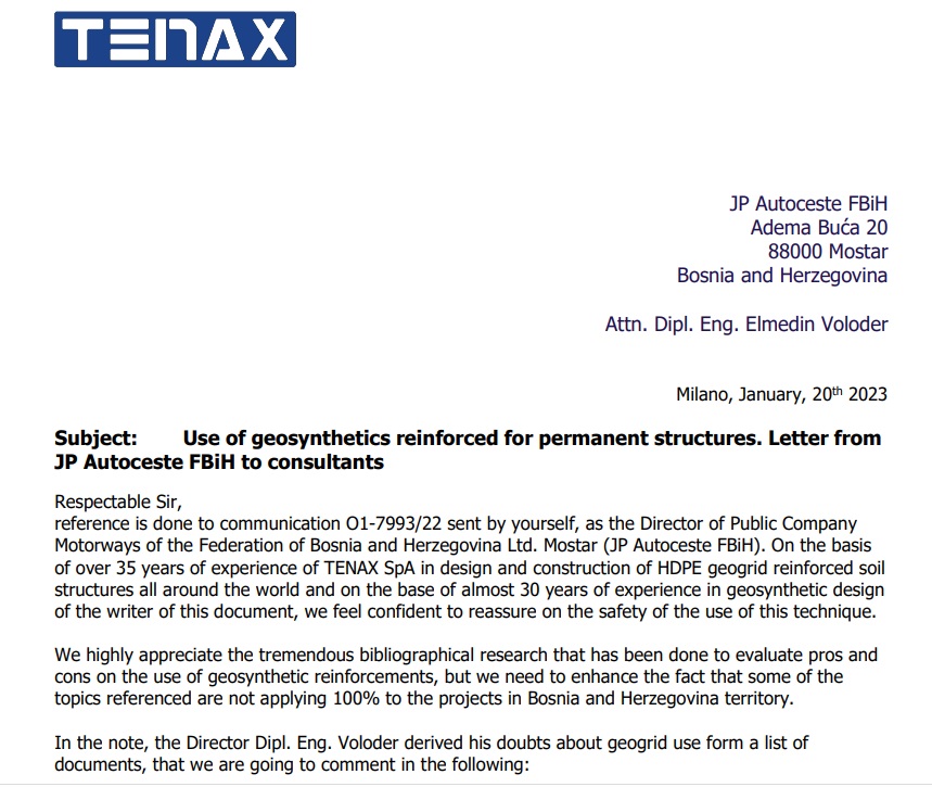 U dopisu renomiranog Maccaferrija, kompanije s tradicijom dužom od 140 godina, ističe se da su građevine izgrađene korištenjem geosintetika danas u svijetu uobičajeno i pouzdano rješenje zbog njihovih visokih performansi, sigurnosti, isplativosti i boljeg utjecaja na okoliš u odnosu na tradicionalna rješenja.