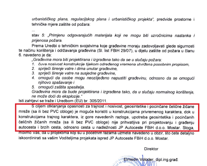 Voloder, naime, u ovoj instrukciji naređuje svim uključenim u gradnju autoputa da „upotreba geosintetika i pocinčanih čeličnih žičanih mreža (sa ili bez PVC obloge) više nije prihvatljiva pri projektovanju i građenju autocesta i brzih cesta u nadležnosti Autocesta FBiH“.