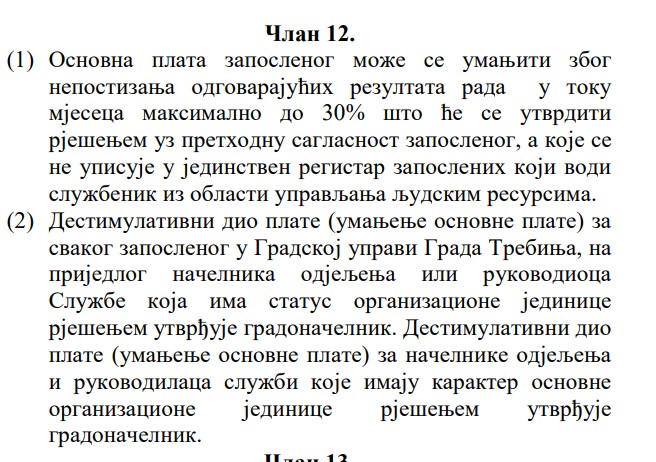 To je bilo definisano članom 12, koji je osporen pred Ustavnim sudom Republike Srpske od strane Sindikata uprave Republike Srpske koji u gradskoj upravi Trebinja takođe ima svoju organizaciju.
