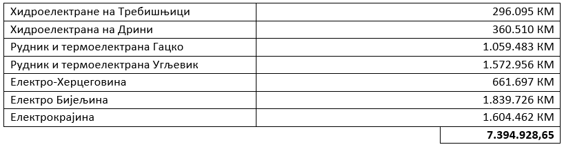 „Hidroelektrane na Trebišnjici“ duguju 296.095 КM, „Hidroelektrane na Drini“ 360.510 КM, a „Elektro-Hercegovina“ 661.697 КM.