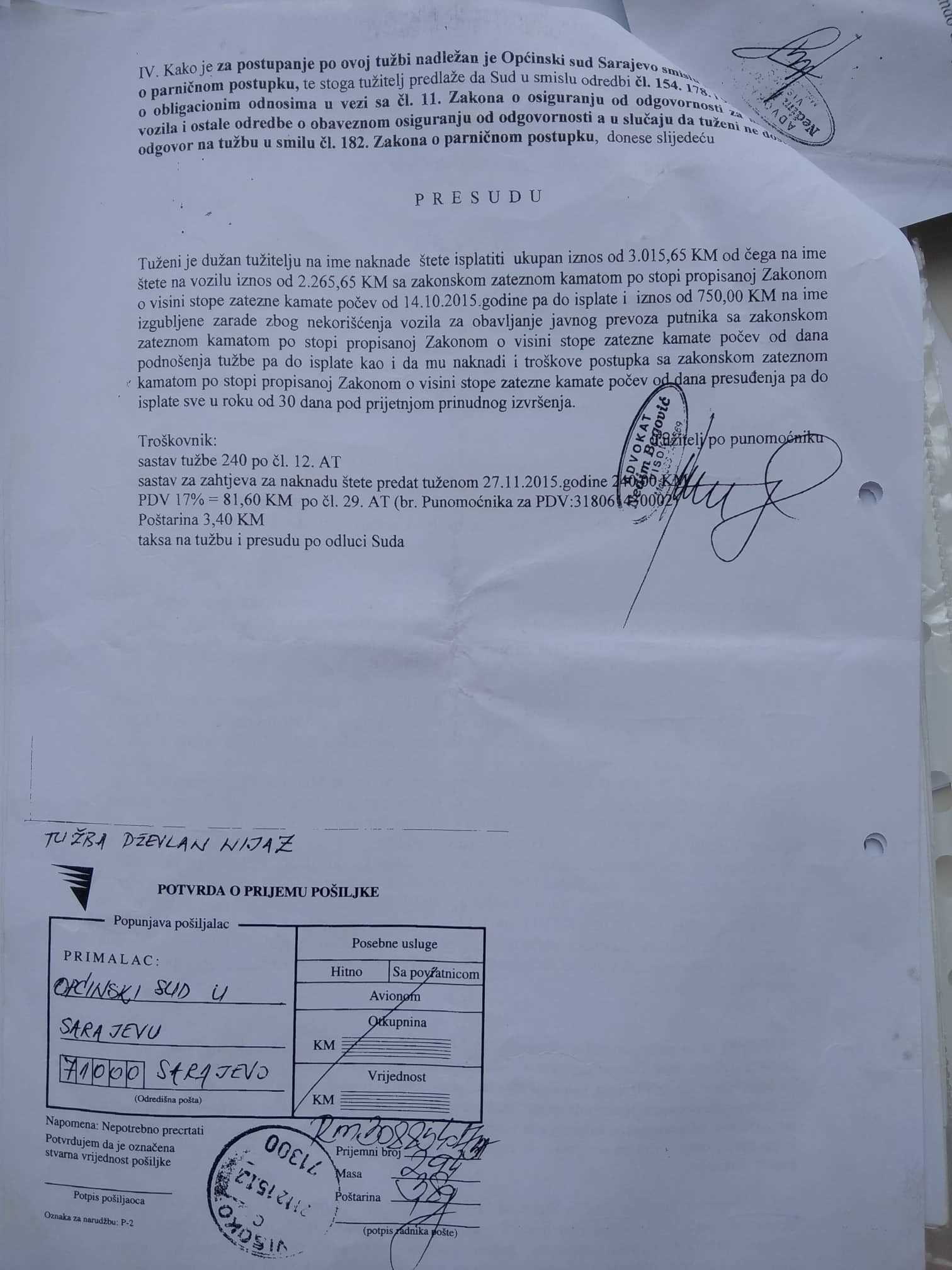 Kaže da sada traži dobrog advokata koji će mu pomoći da napiše tužbu i tuži i advokata i osiguravajuću kuću, za koje tvrdi da su ga izvarali i ugrozili mu egzistenciju. Dževlan govori da je imao dvije saobraćajne nezgode, jednu 2015. godine, drugu dvije godine kasnije, ali da nijednu nije skrivio. Nakon prve, poznanici su mu preporučili osiguravajuću kuću “Gazela” iz Visokog za procjenu i naplatu štete. Rekli su mu da naplaćuju proviziju od 15 odsto od procijenjenog iznosa.
