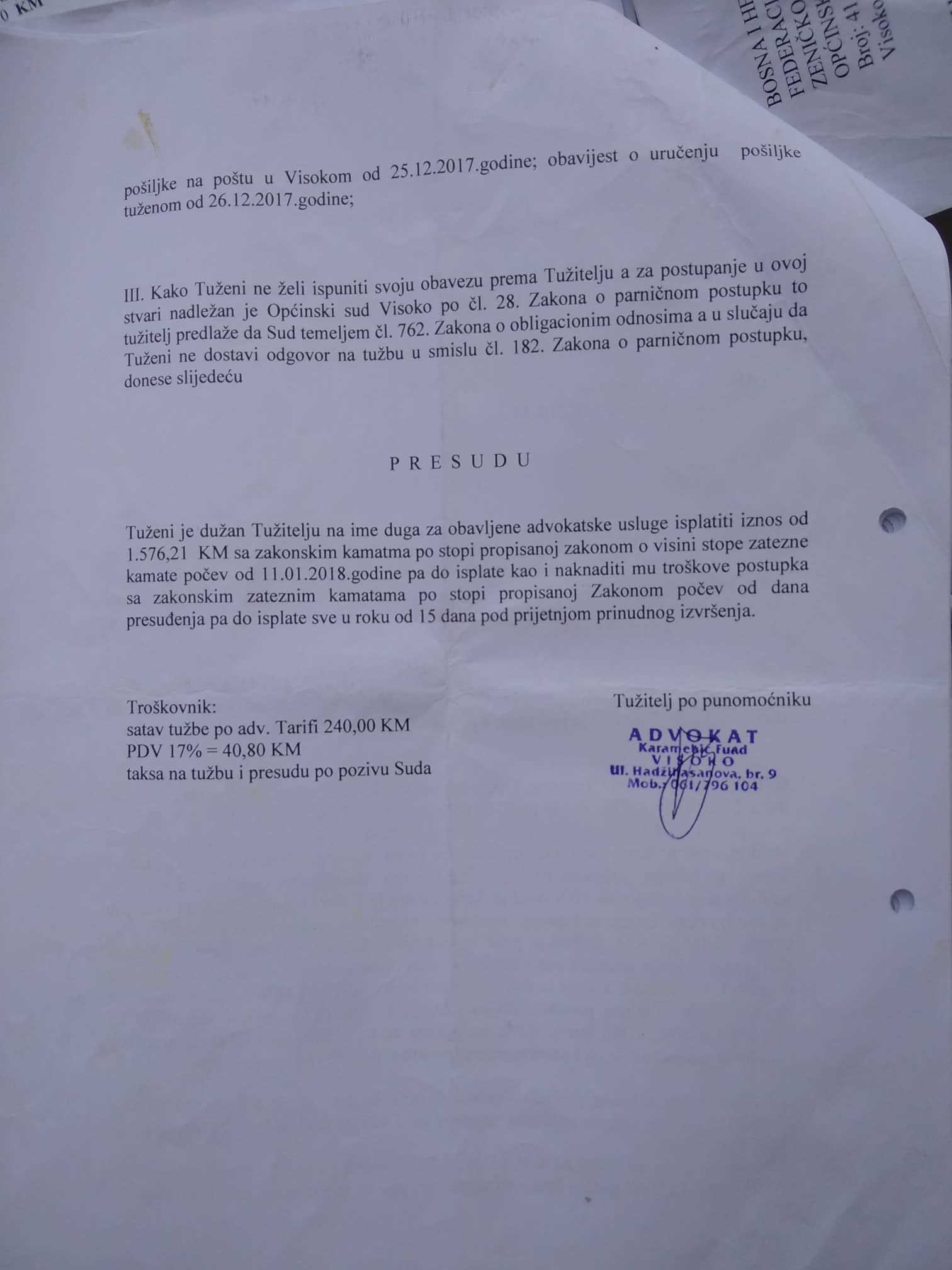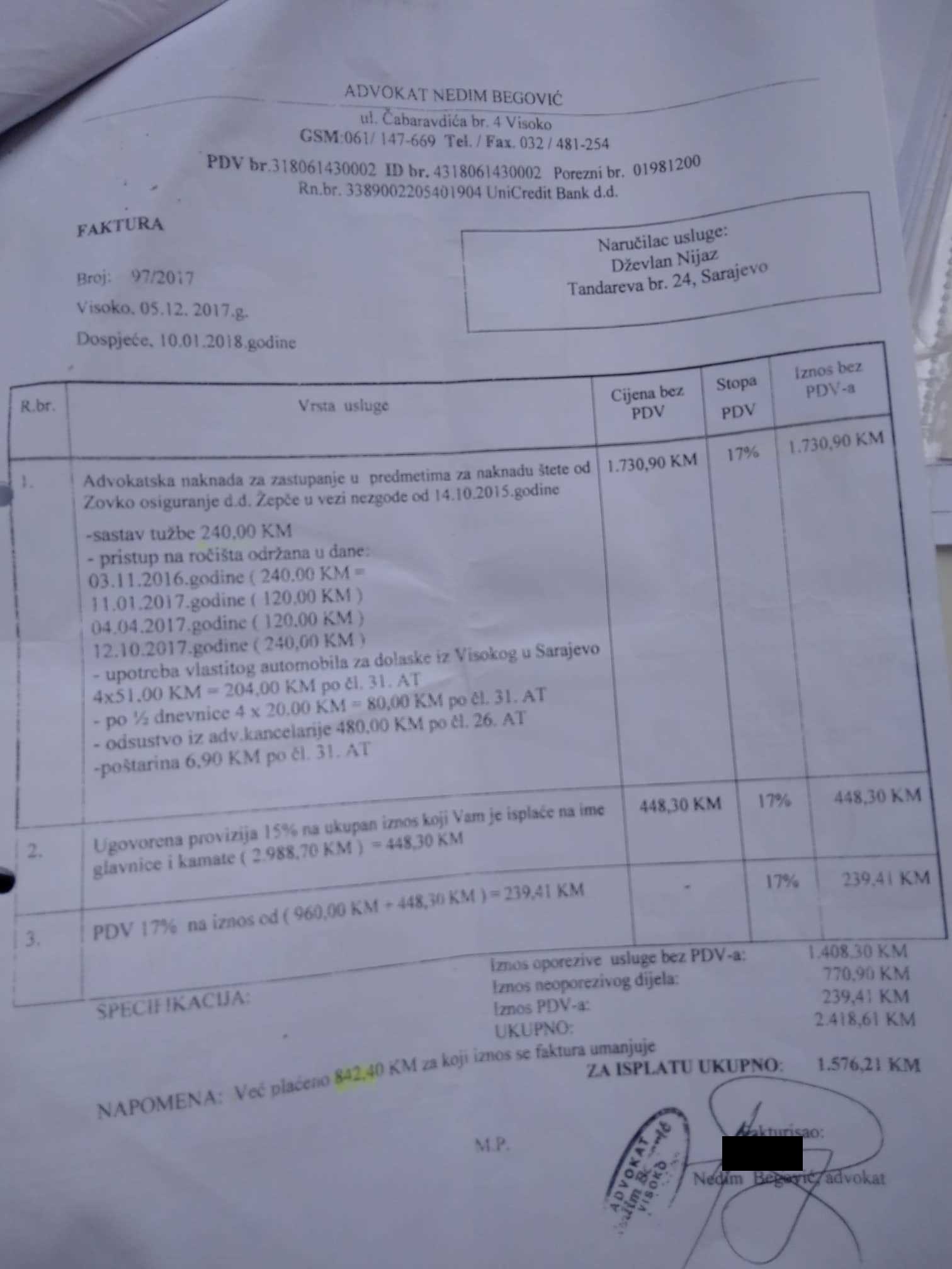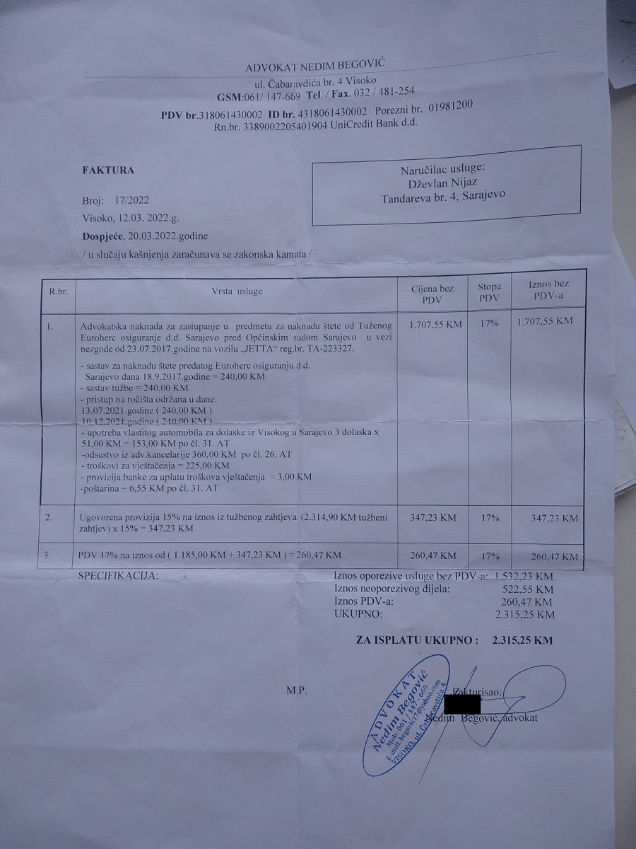 “Opet su mi dali da potpišem blanko punomoć, jer su u žurbi, nisu imali kada da popune i tako dalje. Tada mi je postalo jasno da oni to stalno tako rade i da tu nisu čista posla. Tada sam im oduzeo punomoć, a onda mi je stigao račun na 2.300 maraka, plus troškovi suda od oko 700 maraka. Bilo je tu raznih troškova, poput 120 maraka za napuštanje kancelarije, 240 maraka izlazak na sud, plus dnevnica i 50 maraka troškovi puta od Visokog do Sarajeva. Otišao sam u Advokatsku komoru da se žalim, ali tamo nisam dobio nikakve odgovore”, priča Dževlan.