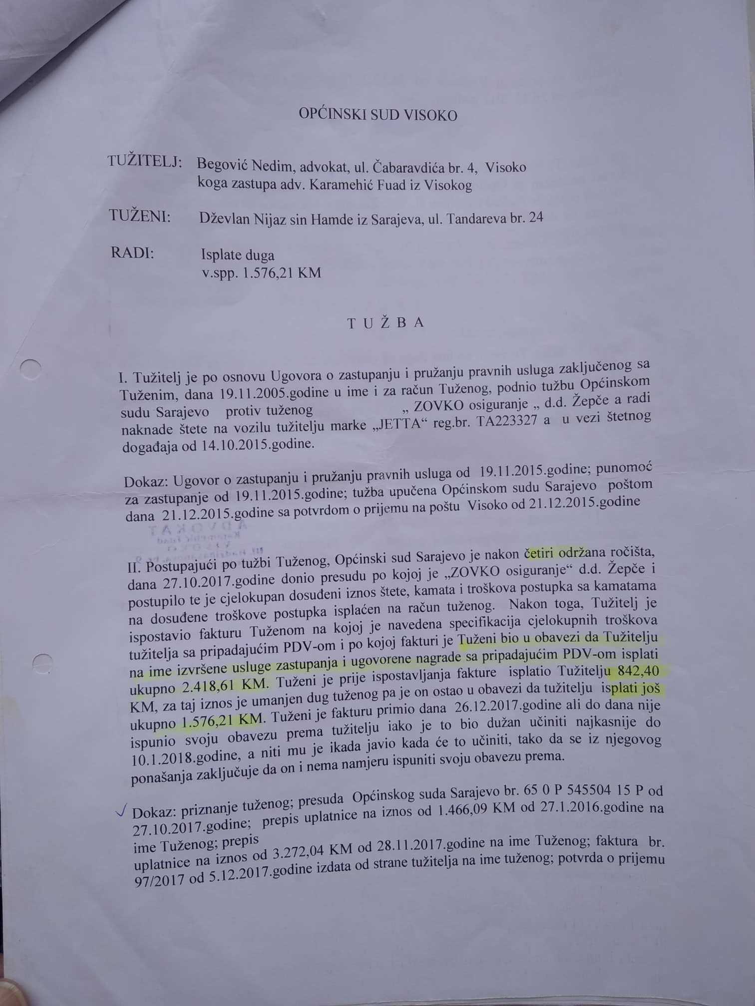 Njega je, kako je sam ispričao, tužio advokat Nedim Begović, koji ga je prvo zastupao u slučaju obeštećenja, a onda tužio zbog računa od 2.300 maraka za usluge, na koje mora da plati više od 700 maraka sudskih troškova.