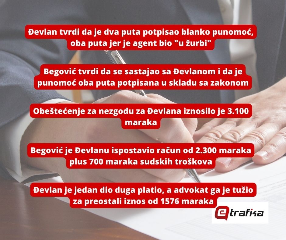 “Nisam do tada ni znao da je bio umiješan neki advokat. Rekao sam da ja nemam ništa sa njegovim advokatom i da sam ja sa njim dogovarao i da do tada nikada nije ni spomenuo nikakvog advokata. Nakon toga mi je stigla tužba tog advokata Begovića i malo po malo, ja sam sada na putu da ostanem bez automobila i osnovnog sredstva od kojeg živim”, priča Dževlan i dodaje da je sada prvo imao nezgodu zbog koje nije mogao da radi, a da su sav novac pokupili advokati i osiguravajuća kuća, te da se on nije namirio u smislu nadoknade štete.